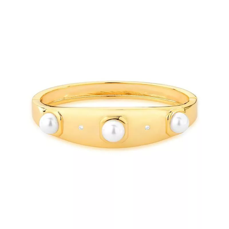 Bracelete c/ Quadrados Liso e Pérolas Shell e Zircônias Redondas na Cor Branca c/ Fecho Magnético - Banhado a Ouro 18K.