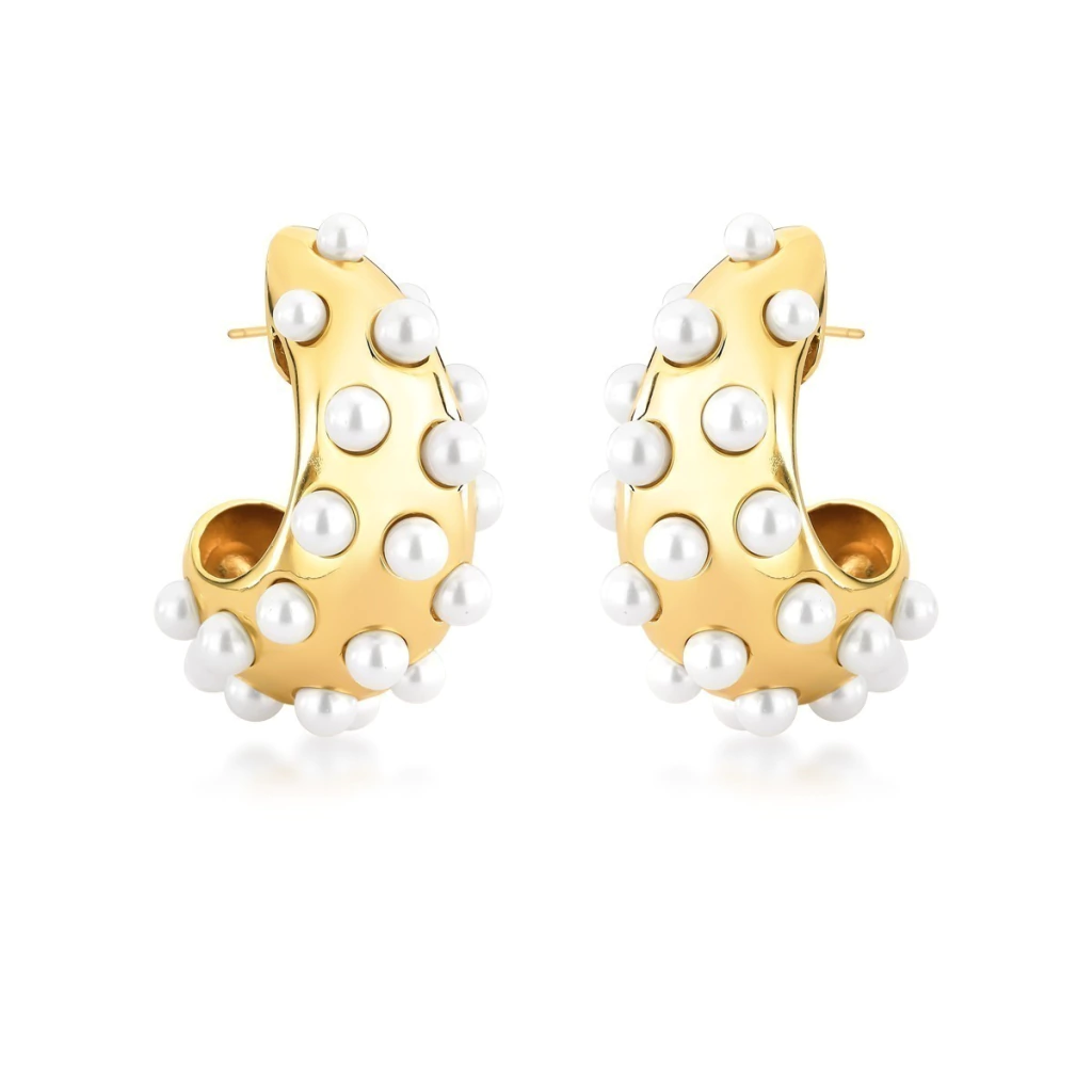Brinco Meia Argola Pérola Shell Cravejado - Banhado a Ouro 18K.