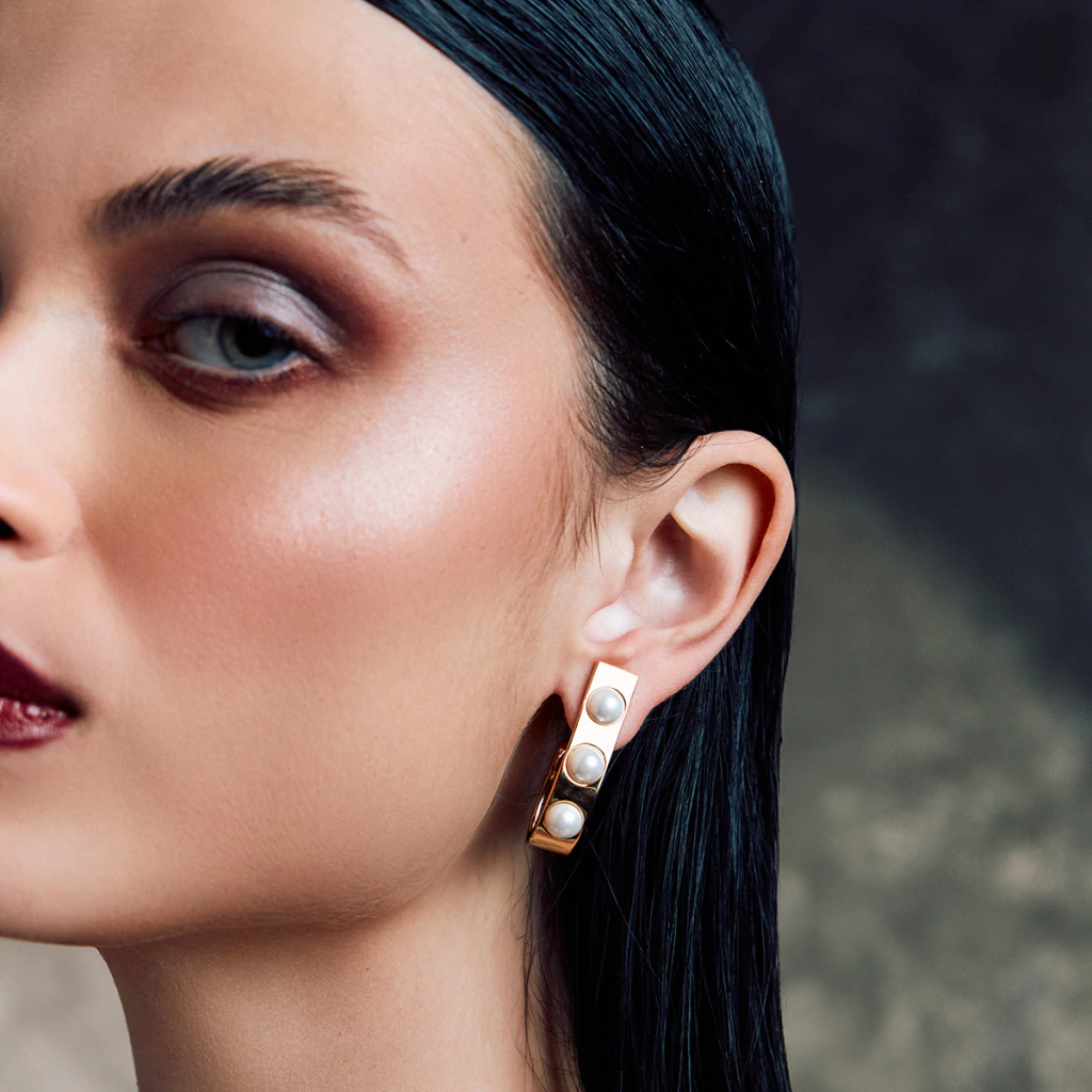 Brinco Meia Argola, no Formato Anzol c/ Três Pérolas Shell Cravejadas - Banhada a Ouro 18K.
